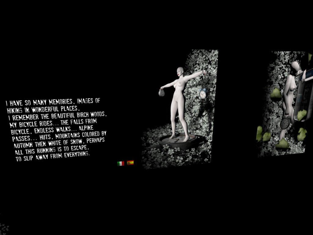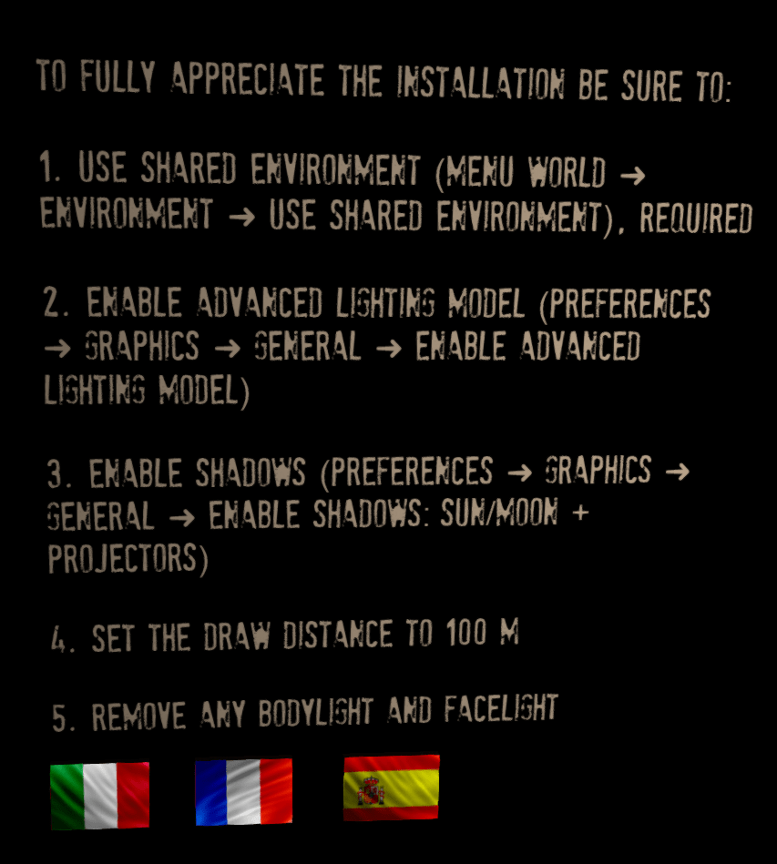 Todos los textos están escritos en inglés, el idioma “oficial” de SL, si bien existe traducción vía chat al italiano y al español. Antes de entrar, la artista aconseja unos requisitos gráficos que debemos estar seguros de activar para poder disfrutar de toda la potencia visual de la instalación. Podéis verlos en la siguiente foto .